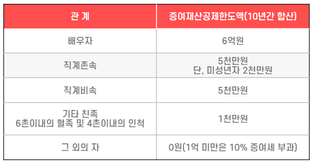 - 그 외의 자: 0원 (1억 미만인 경우 10% 증여세 부과)