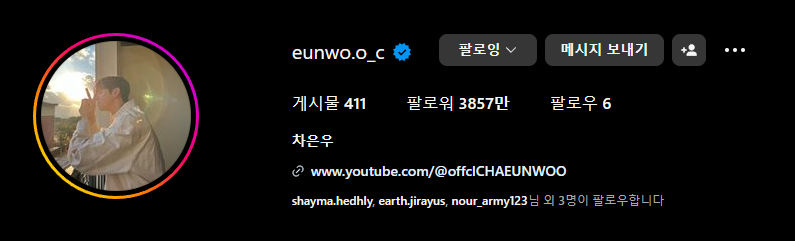 차은우의 인스타그램 아이디는 eunwo.o_c로 '우'발음이 나는 oo의 사이에 점을 찍었습니다. o.o