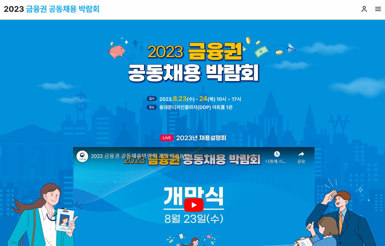 금융권 64개 기관은 '2023 금융권 공동채용 박람회'의 개최에 앞서서 2023년 7월11일부터 '2023 금융권 공동채용 박람회'홈페이지를 개설해서 운영중입니다.